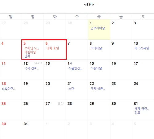 👉 5월 5일 (어린이날, 석가탄신일 겸 대체공휴일)
